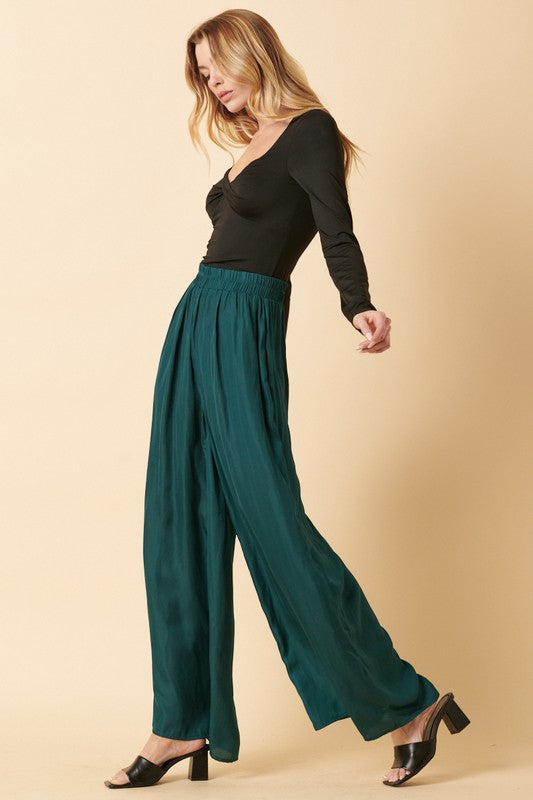Light weight satin woven fabric wide leg pant with elastic cover waist band and side pocket. Available in black & hunter green.