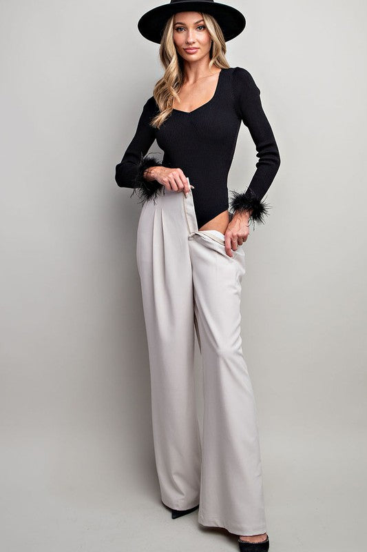Step up your style game with our newest arrival - a long sleeve solid bodysuit that's as fierce as it is comfortable! With its ribbed texture, flattering scoop neckline, and snug fit, it's a wardrobe must-have. But that's not all - this beauty features a snap button closure for easy wear and stunning feather cuff detailing for a touch of elegance. Get ready to make heads turn and hearts flutter, babes! 💃🔥